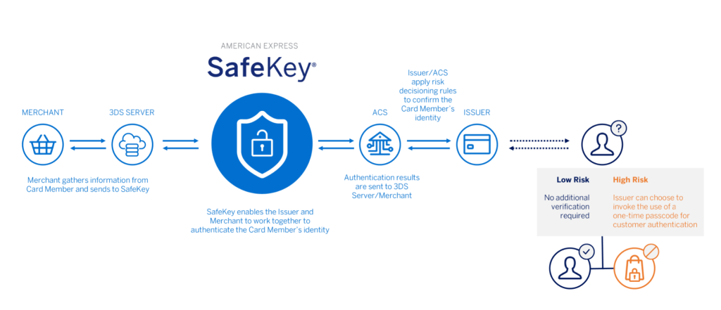 The business utilizing SafeKey provides the transaction details, where it is authenticated to confirm the cardholder's identity. If it's determined that the transaction is low risk, no additional verification is needed. If the transaction is determined to be high risk (due to being unable to confirm details of the cardholder's identity) then the issuer can choose to require additional authorization through a one-time-use passcode.