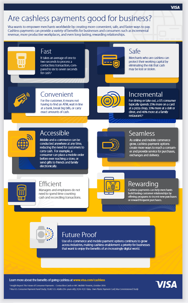 There are several significant benefits to moving to a cashless payment model, including faster service, easier financial reconciliation, reduced risk of theft, and appeal to customers who don’t carry cash. Visa, a proponent of cashless transactions for the obvious reason that it earns money from card payments, produced an infographic on the benefits of going cashless. https://usa.visa.com/content/dam/VCOM/global/about-visa/documents/cashless-infographic.pdf