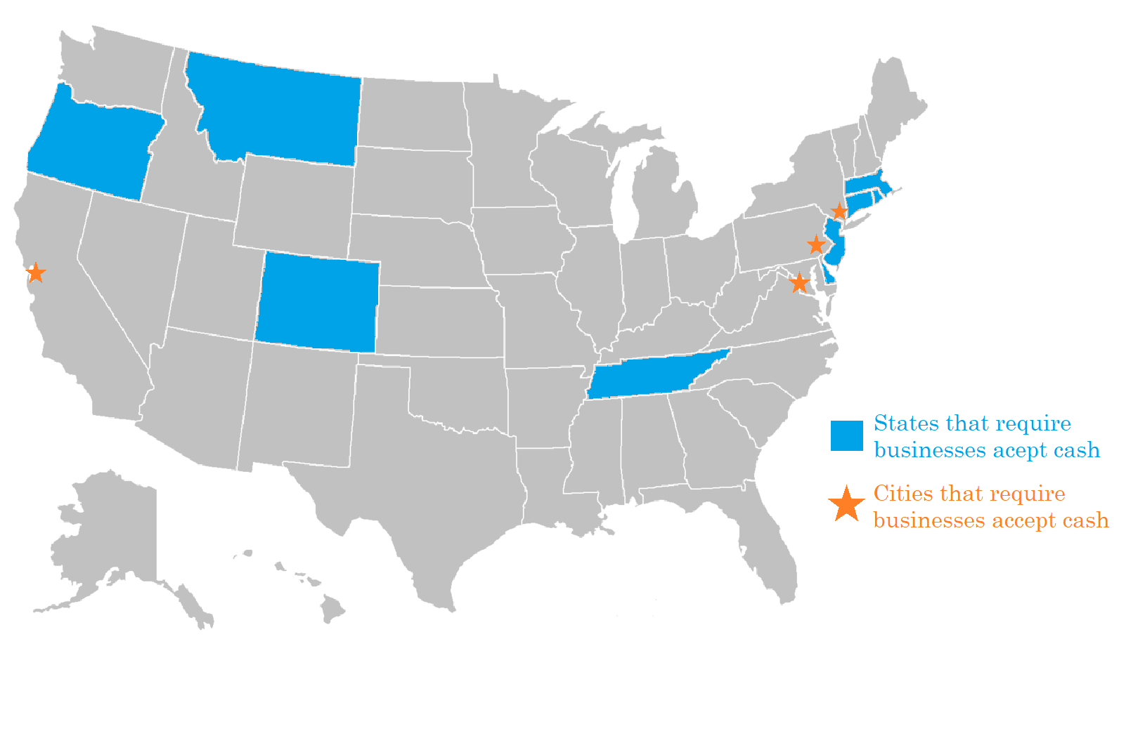 If your business operates in one of those cities or states, you are required to accept cash as a form of payment. You also are not permitted to charge a customer more for using cash.