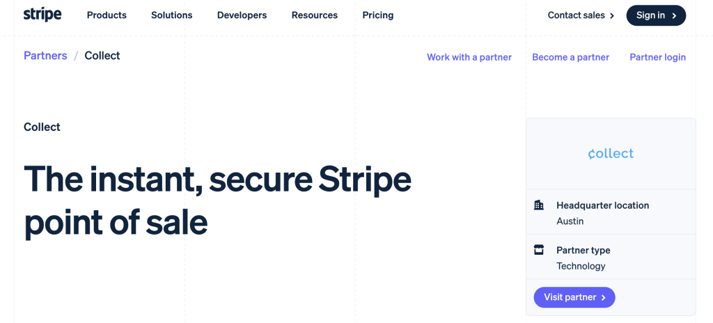 Collect for Stripe is an app that allows you to accept credit cards in person using your smartphone or tablet and a Stripe merchant account. You can use compatible card readers to accept magstripe or EMV chip cards, or manually enter the card information without using a reader. Collect is technically not part of Stripe, but Stripe does endorse Collect for use with its credit card processing services as a partner. The screenshots below show Collect listed on Stripe’s website in the partners section.