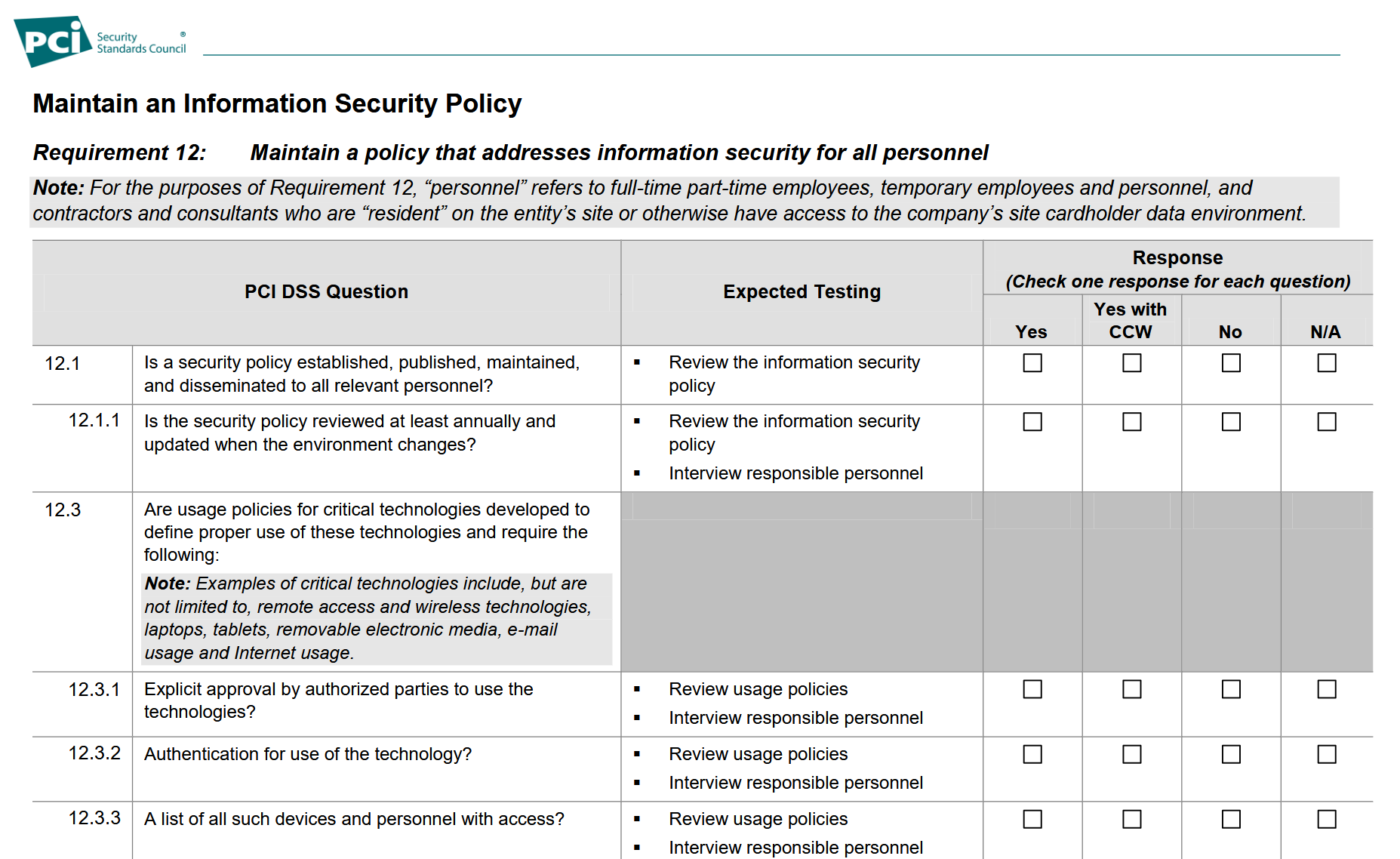 Since the SAQs are lengthy, it’s best to tackle them in smaller chunks. For example, the SAQ C has 12 requirements, each with multiple subsections. You could start by taking a look at each requirement, noting the number of subsections, and determining how much time to allocate to that requirements. Perhaps you prefer to have a set amount of time, like spending 1 hour per day, or you may prefer a results-based option like completing one subsection of requirements per week. Requirement 12 is about maintaining an information security policy, specifically “support information security with organizational policies and programs.” It specifies that the policies can be right-sized to match the complexity of your business’s operations and must be provided to your staff so they’re aware of their responsibilities. You might look at requirement 12, see that it has multiple subsections, but realize that many of them will have the same expected “testing” such as interviewing your staff about the policies. So you may decide to tackle one requirement per week or group several together, and then do the “testing” all at once.