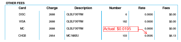 In the statements we’ve reviewed (screenshots below) the way that Mercury added fees was to increase the cost of assessments required by the card brands (Visa, Mastercard, and Discover.) That means that Mercury charged a fee that’s part of their true cost, but instead of charging only as much as they had to, they added more money to the fee. Basically, they inflated the true cost. In the example below, the assessment called MC NABU is an assessment charge from MasterCard. Mercury Payment Systems charged this business $0.0595. However, MasterCard’s charge is $0.0195. Mercury added 4 cents to keep as their profit, but disguised it as a Mastercard assessment charge.