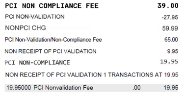As you can see, different processors refer to the fee by different names, including PCI non-validation, non receipt of PCI validation, and non-PCI chg (charge.) Despite the variation in terms, all of them refer to the same fee: PCI non-compliance charge because you're considered non-compliant.