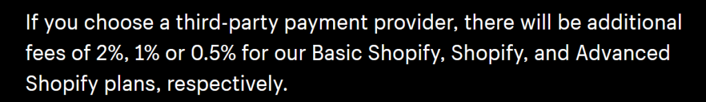 The text reads: If you choose a third-party payment provider, tehre will be additional fees of 2%, 1%, or 0.5% for our Basic Shopify, Shopify, and Advanced Shopify plans, respectively.