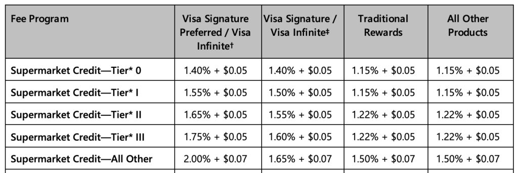 Once you know the tier for the supermarket, you can review the interchange table for Supermarket Credit, which includes rows for different types of Visa credit cards:
