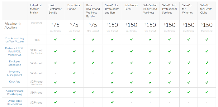 The included features vary depending on the bundle you choose. If you'd prefer, you can purchase "modules" ala carte to create your perfect POS solution. Individual modules range from $10/month for basic accounting to $25/month for more complex features like inventory management or recurring billing.